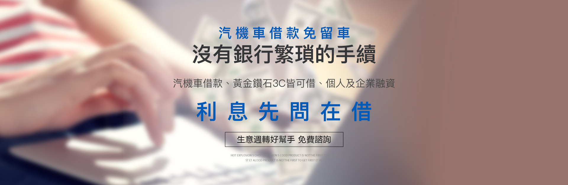 本公司成立於1999年,提供多元的財務金融服務,包括台中汽車借款、台中機車借款,台中支票借款,房屋二胎、支票貼現以及企業融資。十多年來的用心經營,始終穩居借款人心目中最合法,最安心的龍頭地位,成立宗旨和經營理念是希望建立銀行以外一個合法、便利、透明的金融服務單位。